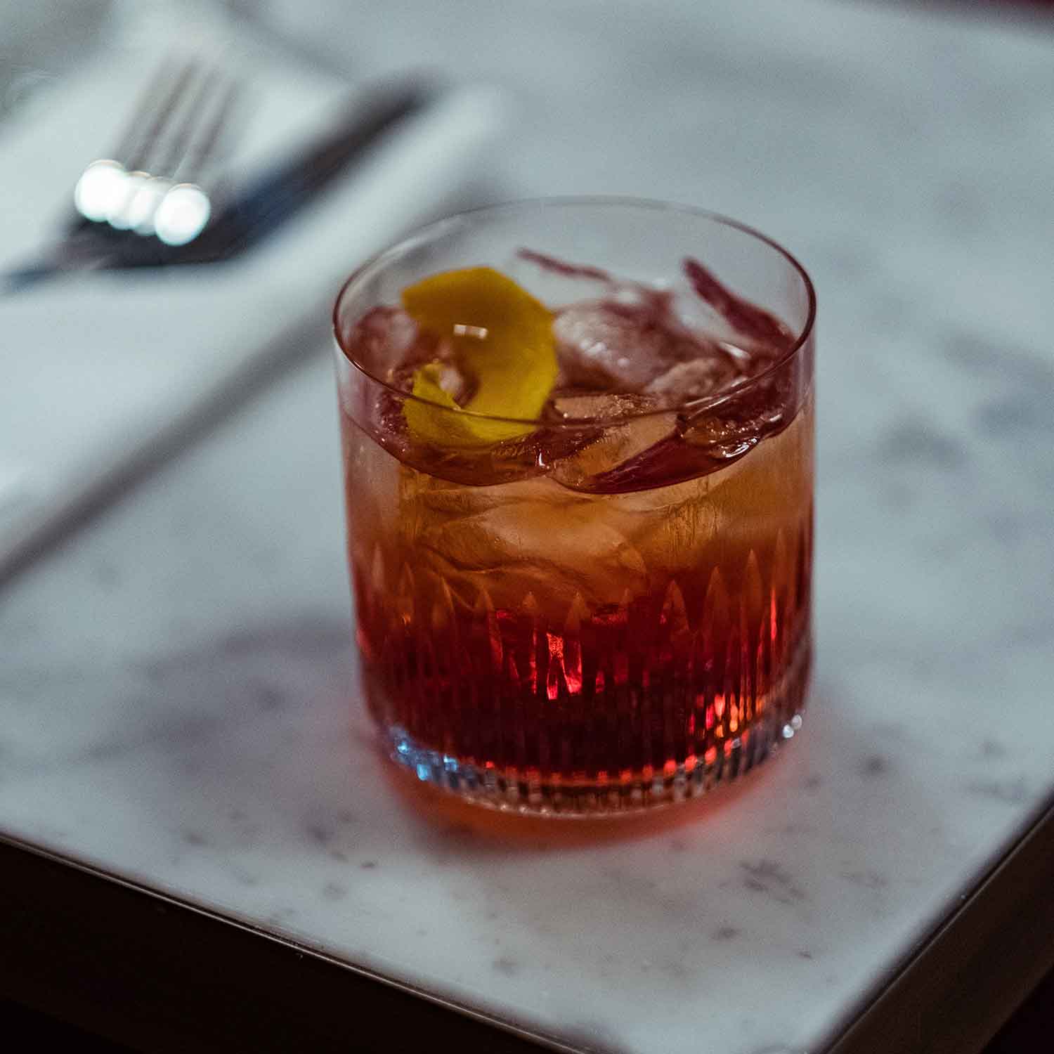 Maridaje Sencillo, pon un poco de hielo en un vaso corto, corta una cáscara de naranja y disfruta de tu Lauro Negroni.